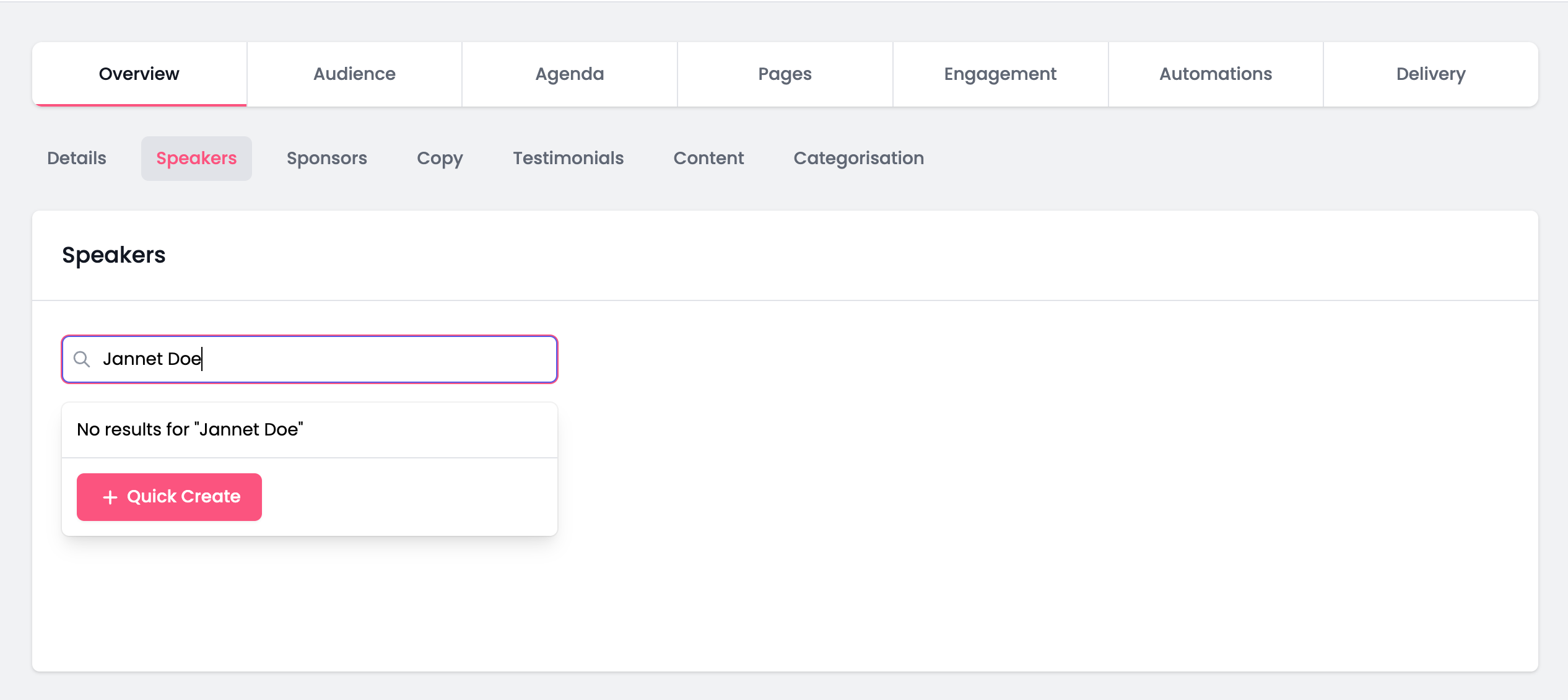 This guide walks you through the steps to add and manage speakers for your event. You can either select existing speakers from your hubs or create new ones as needed.