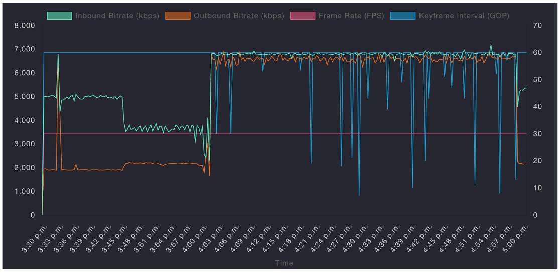In our experience keyframe interval spikes as shown below tend to indicate poor connection performance and frame rate spikes tend to be indicative of poor encoder performance.