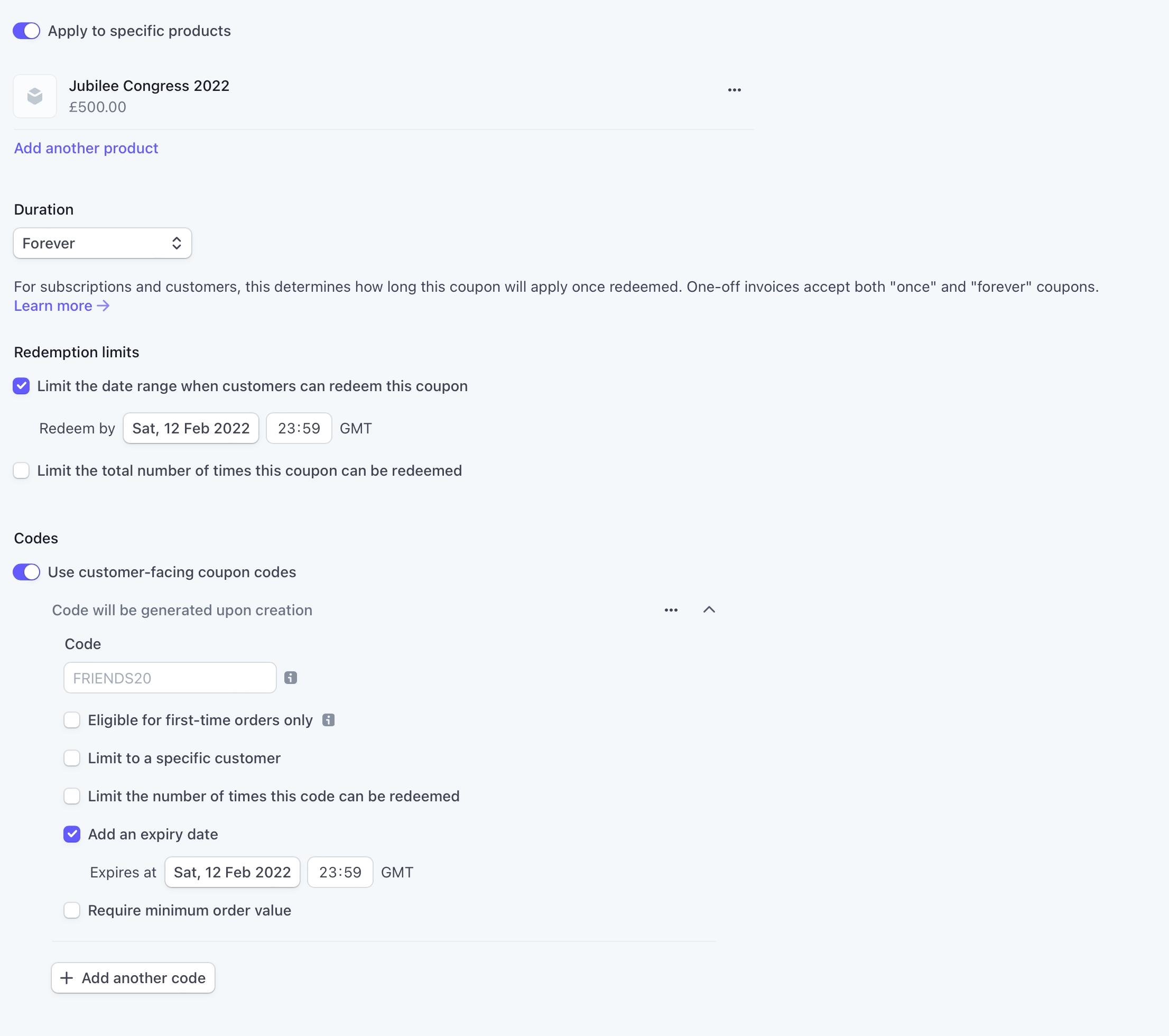 Create the customer-facing coupon code and add an expiry date. Your coupon should look like this: