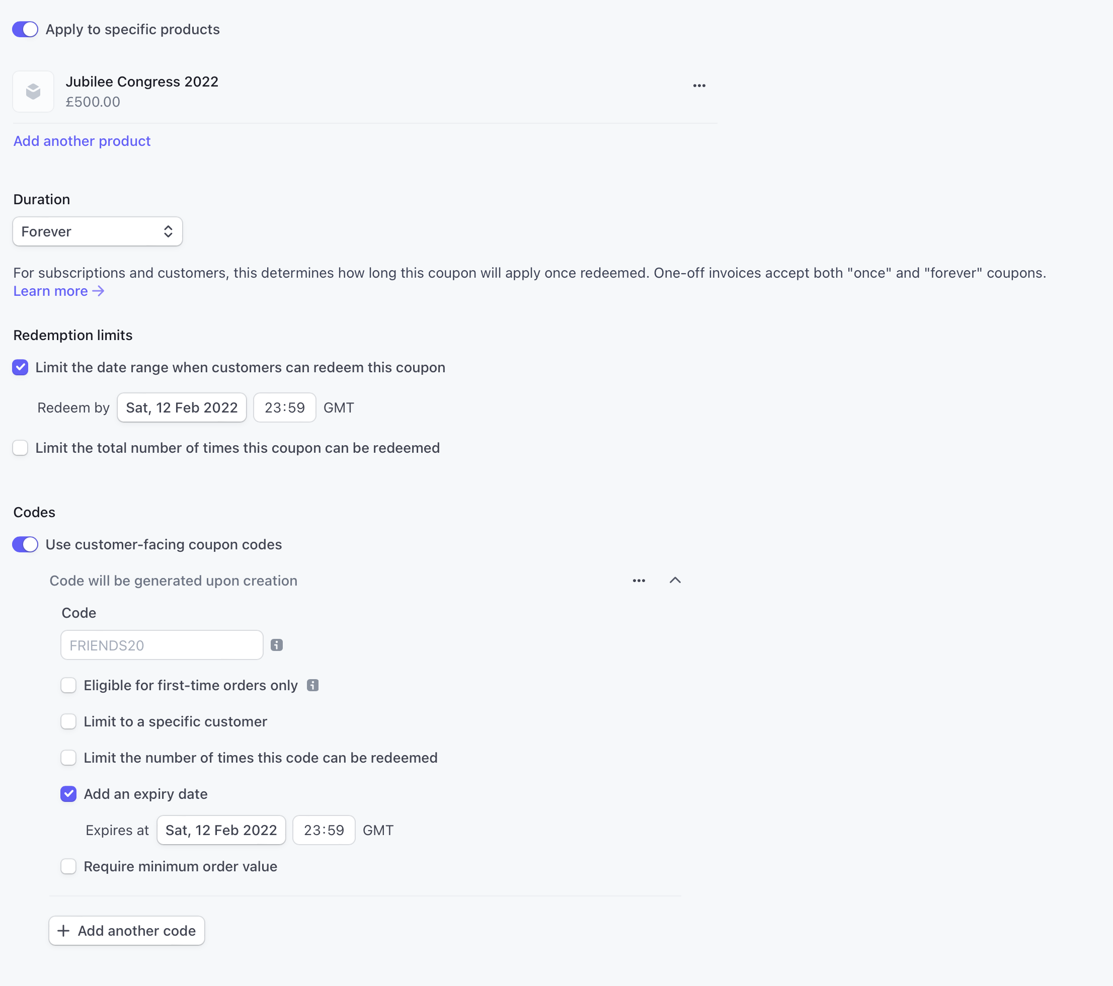 6. Create the customer-facing coupon code and add  an expiry date. Your coupon should look like  this: