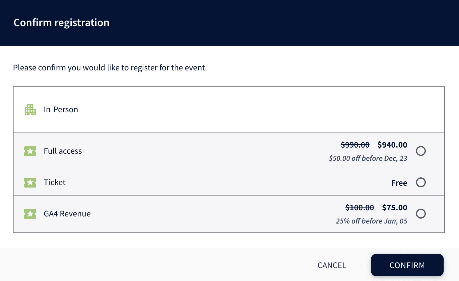 It is now possible to schedule discounts that automatically apply to tickets based on a date range. This allows the management of early-bird rates and discount periods from within the Events interface. It simplifies the workflow for event managers as coupons no longer require configuration within Stripe.